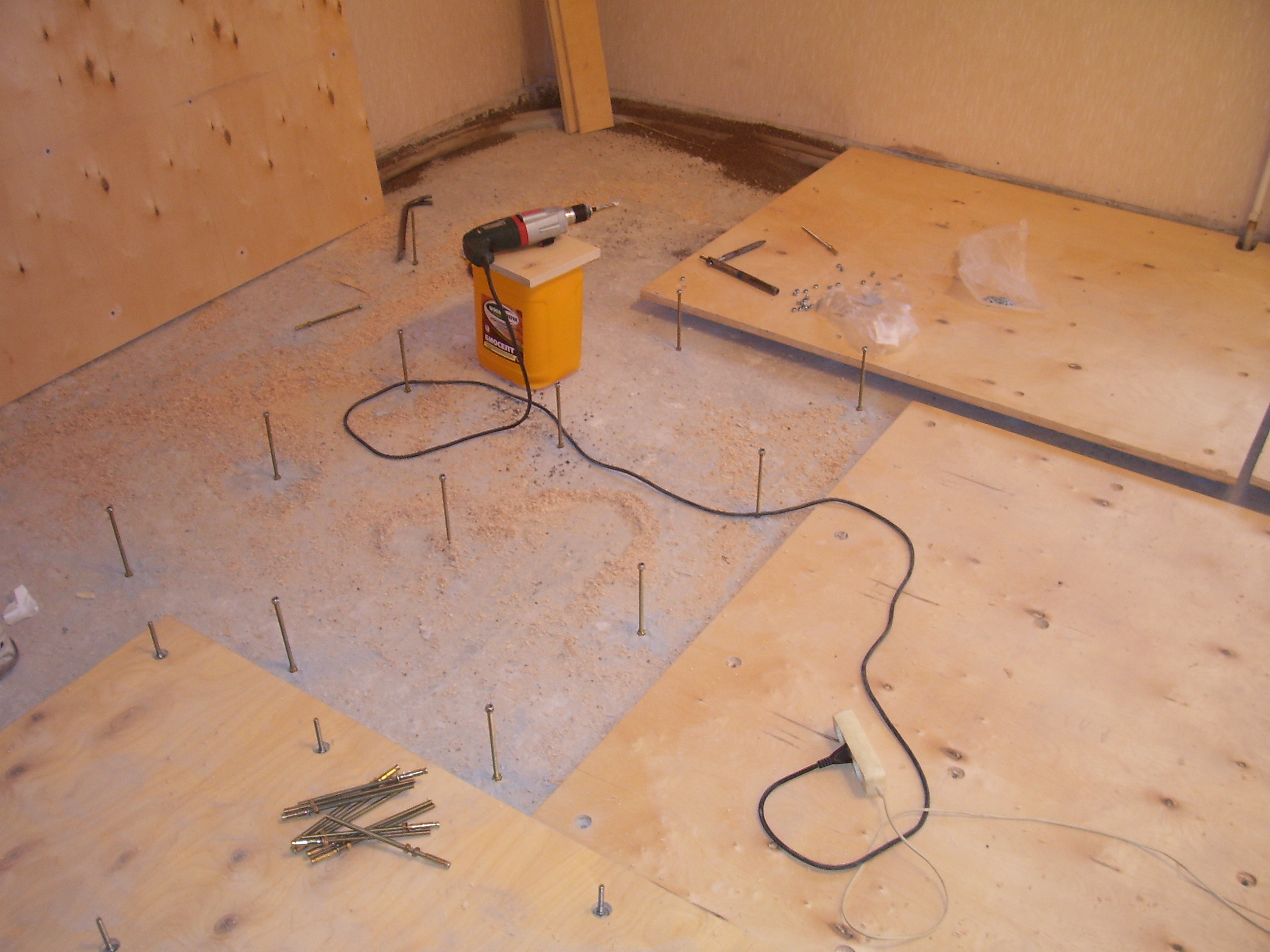 Шаклевка из ПВА и опилок: опилки заливают водой, после чего отжимают и смешивают с клеем до густоты домашней сметаны. На полу выставляются рейки - маячки. Заливается первый слой шпаклевки. После ее высыхания заливается еще один - выравнивающий слой. Полное высыхание пола происходит через двое суток.