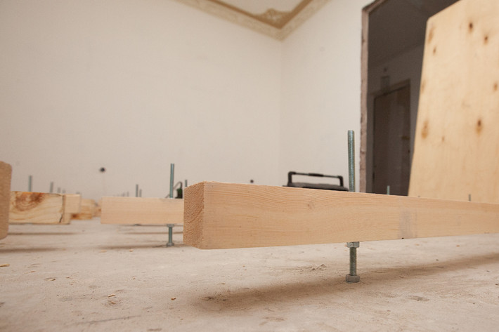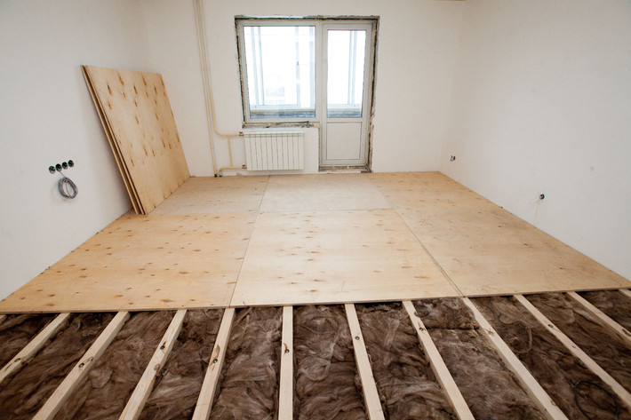 Бетонное основание можно выровнять при помощи самовыравнивающихся смесей, стяжки из бетона, регулируемой фанерой, сухим сборным полом Кнауф, а также изготовлением обрешетки из лаг (как обычных, так и регулируемых).