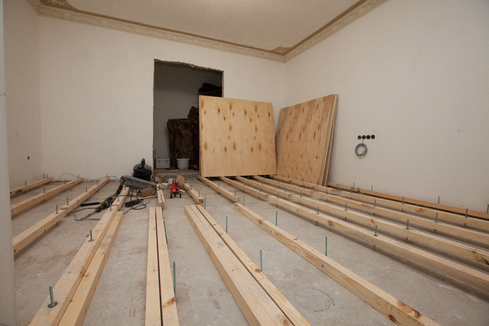 Выравниваем пол своими руками - деревянное основание. При небольших неровностях такой пол можно просто отциклевать, используя вначале крупнозернистую наждачную бумагу, после чего обрабатывая полы при помощи мелкозернистой наждачки. Более серьезные перепады можно исправить при помощи самонивелирующихся смесей. Для этого деревянный пол очищается от старого покрытия и обрабатывается специальной влагозащитной грунтовкой. Для надежности на деревянный пол можно уложить влагозащитную мембрану.