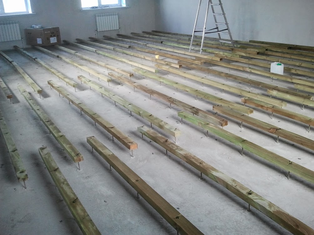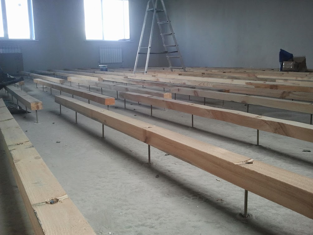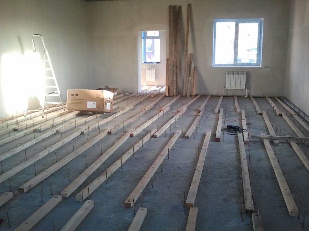 Выравнивание основания при помощи бетонного раствора. В этом случае, чтобы изготовить ровные полы своими руками, необходимо установить на пол выставленные по одному горизонтальному уровню маячки. Маяками могут быть металлические профиля для гипсокартона, деревянные балки, или цементные кучи. Маяки устанавливаются на основании с шагом до восьмидесяти сантиметров, выравниваются по уровню и крепятся к полу. После этого пространство между маяками заливается бетонным раствором, или специальной смесью. Залитую поверхность необходимо тщательно выровнять, используя двухметровое правило.