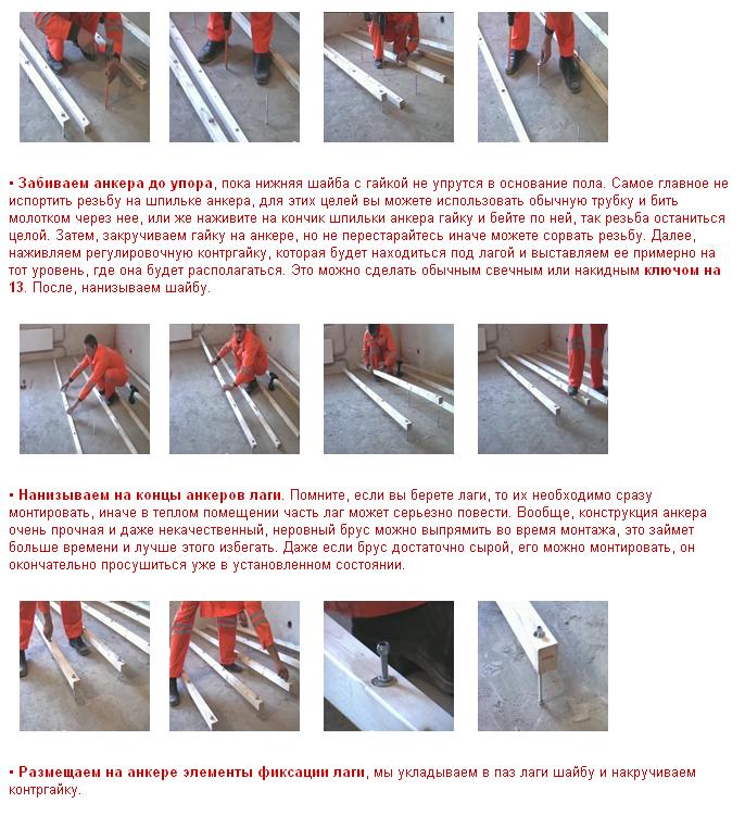 Можно сделать лаги для пола своими руками. Для этого необходимо приобрести качественно просушенный деревянный брус, прямоугольного сечения, обработать его антисептическим составом и просверлить в нем необходимые для втулок отверстия. На каждые два погонных метра бруса необходимо изготовить около шести отверстий. Более дешевый вариант регулируемого пола - сделанные лаги для пола своими руками и строительные шпильки с гайками, на которых будут крепиться лаги.