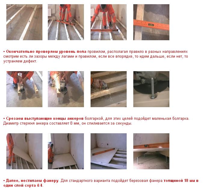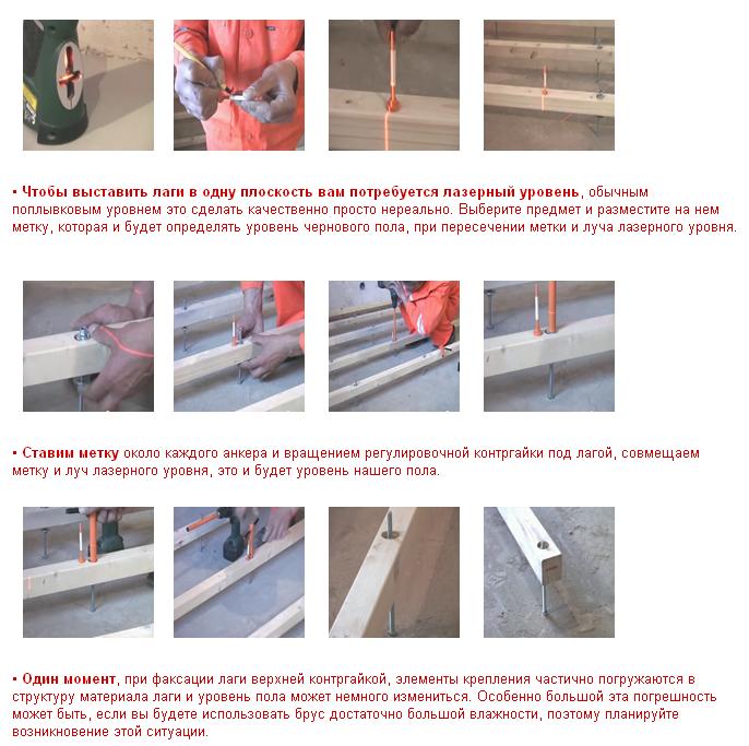 Принцип установки фальш полов довольно прост: в отверстия в лагах вставляются пластиковые втулки, которые внутри оборудованы резьбой. В них ввинчиваются болты. После того, как лага закреплена на основании, болт вращается специальным ключом, поднимая или опуская лагу на необходимую высоту. После выравнивания все элементы конструкции жестко крепятся между собой, а оставшиеся концы болтов срезают заподлицо к лагам.