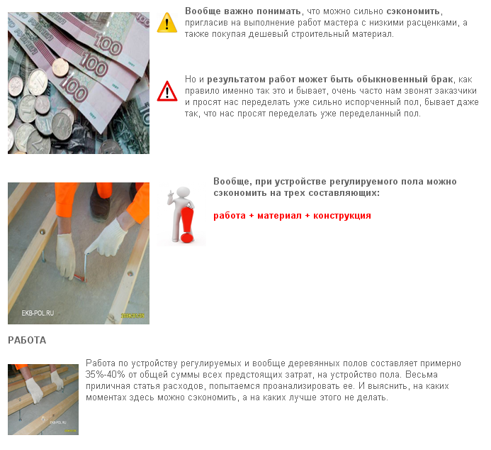 К "мокрым " относят изготовление песчано-цементной стяжки, стяжки из самонивелирующихся строительных смесей. К сухим относят полы Кнауф, укладку полов на лаги, а также использование регулируемых конструкций, которые позволяют выравнивать пол при помощи лаг и фанеры.