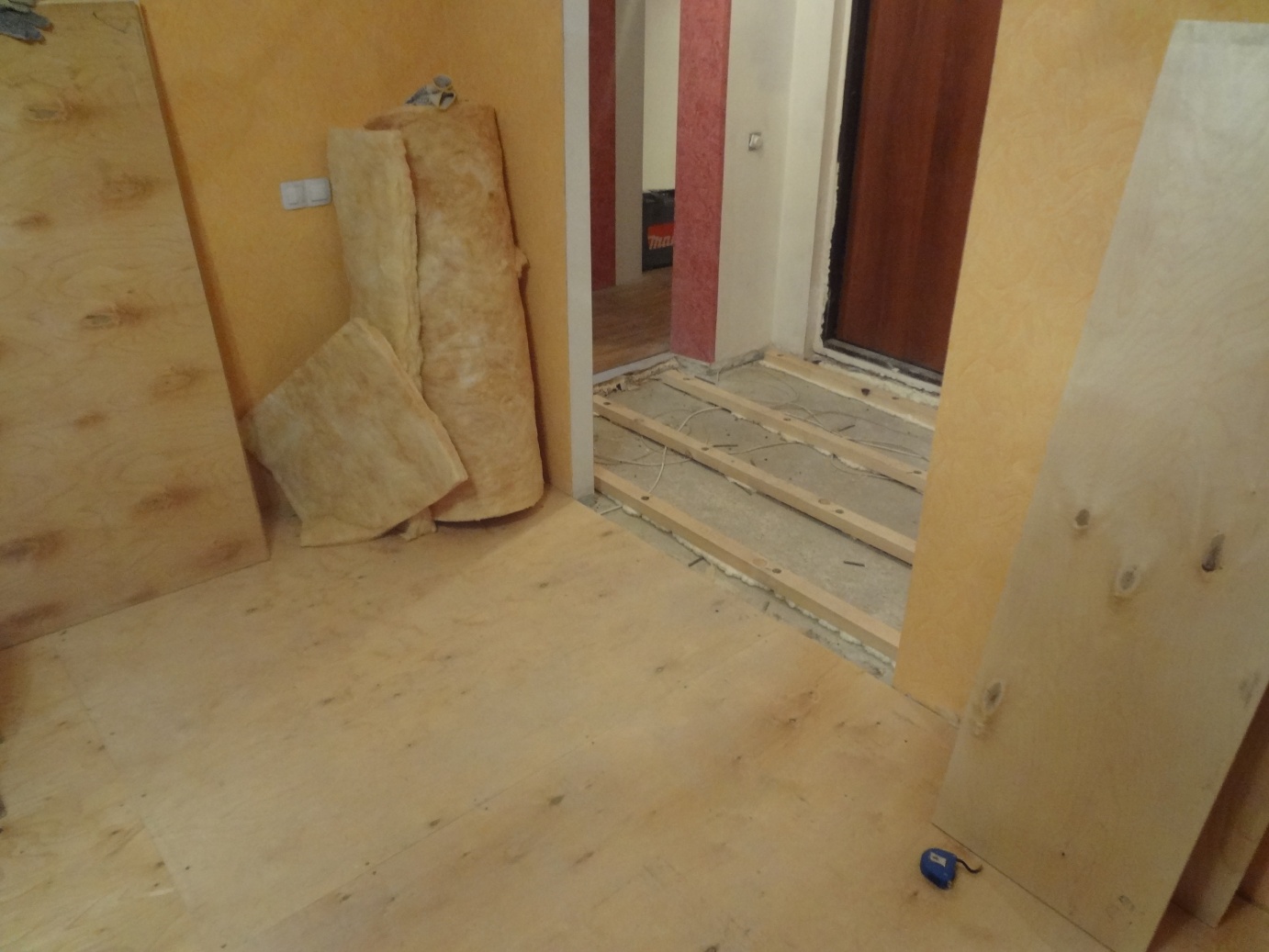 В стене, к которой будет подводиться электричество, вырубается штроба и высверливается отверстие для терморегулятора. В материале для утепления также делается продолговатое отверстие под гофру, в которую будет установлен тепловой датчик. Длина отверстия может варьировать от пятидесяти сантиметров до метра. В гофрированный шланг вводится провод с тепловым датчиком, после чего она укладывается в проделанное в утеплителе отверстие. Провод нагревательных элементов также необходимо спрятать в в гофру.